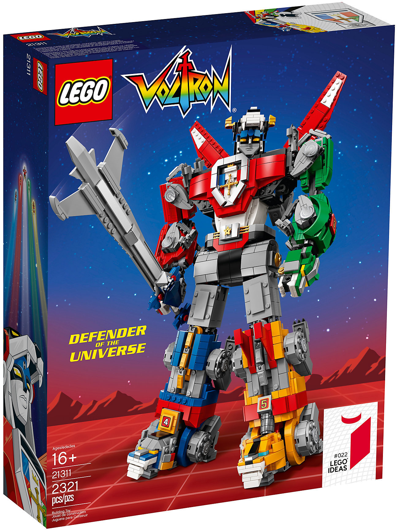 Je čas bránit vesmír, proto se připrav na sadu 21311 Voltron od LEGO® Ideas, která obsahuje největšího sestavitelného LEGO robota všech dob! Tato úžasná sada obsahuje sestavitelné a dobře nastavitelné černé, modré, žluté, červené a zelené lvy se speciálně navrženými, extrémně silnými klouby, které ti umožňují je všechny zkombinovat a vytvořit tak super robota Voltrona. Součástí sady je také obří meč a štít, které lze dát Voltronovi pevně do rukou. Ideální pro vystavení nebo pro přehrání napínavých akčních scén z původního animovaného seriálu Voltron z 80. let a moderního seriálu od DreamWorks s názvem Voltron: Legendární obránce.